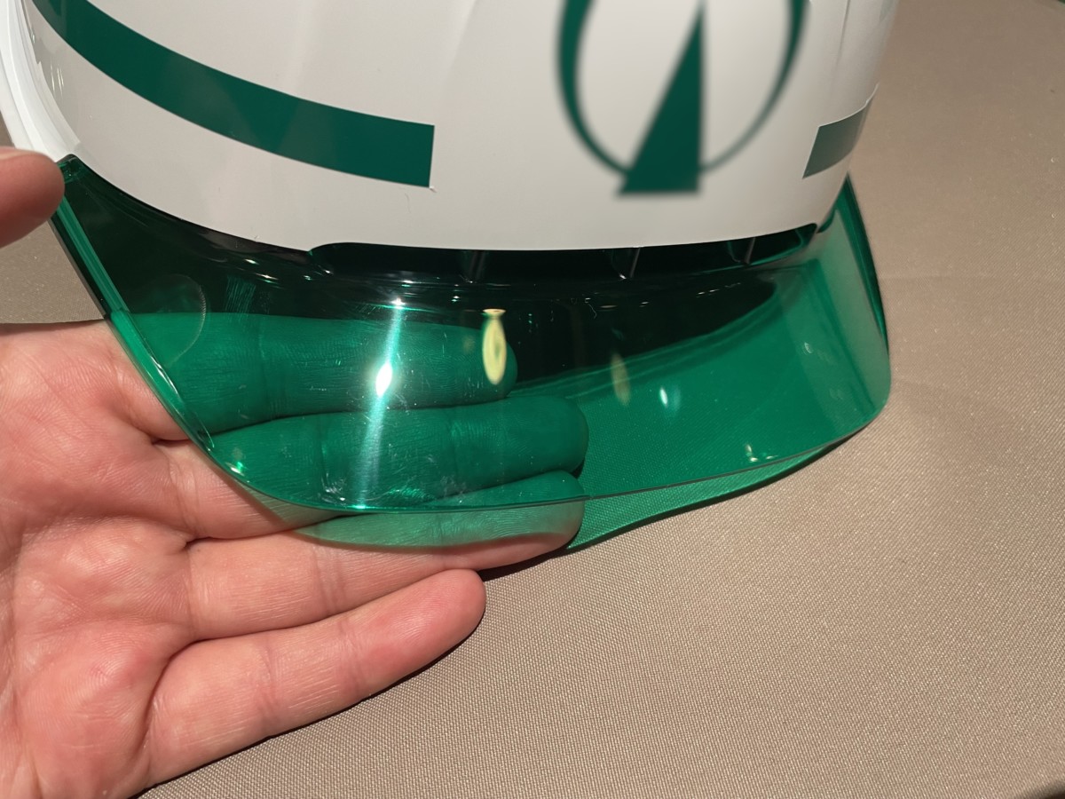 カタログをもとに、数あるデザインの中からまずは形選びです。外で暑い中の作業ということもあり、少しでも快適さを確保したいということで、通気孔のあるタイプを選択。ひさしは、ヘルメットを着用しながらでも、上方を確認した場合見えるように、スケルトンタイプをお選びいただきました。そして会社ロゴをデータでいただき、名入れ文字内容のご希望を伺い作成開始です。およそ2週間程度で出来上がってきました。思い描いていたものが形になると、嬉しいですよね。お客様も納得の仕上がりに喜んでおられました。