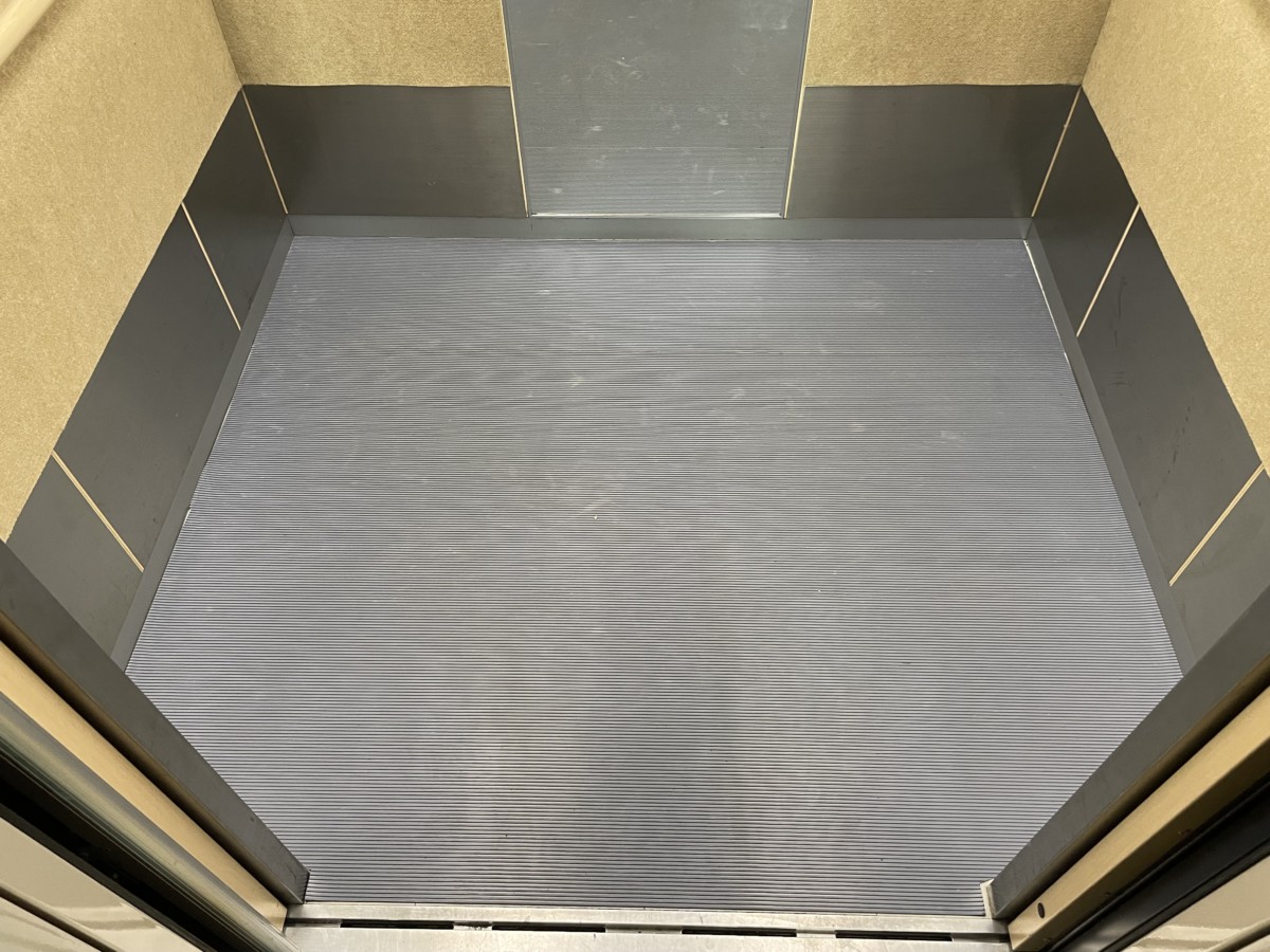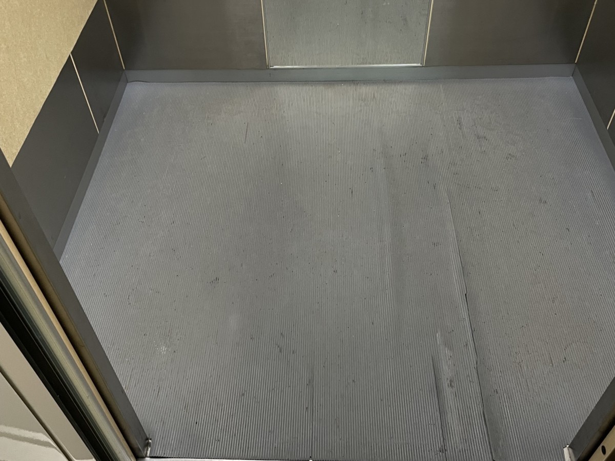 現在お使いのマットサイズを採寸をし、メーカー協力のもとご要望をお伺いしながら見積。入れ替えに至ることができました。今回納入させていただいた商品は、ゴム素材の筋入りゴムマットです。厚さ3㎜と薄いですが、弾力性に富んだ安全性の高いゴムマットで、公共施設の特にエレベーター内のマットとしては主流な商品です。