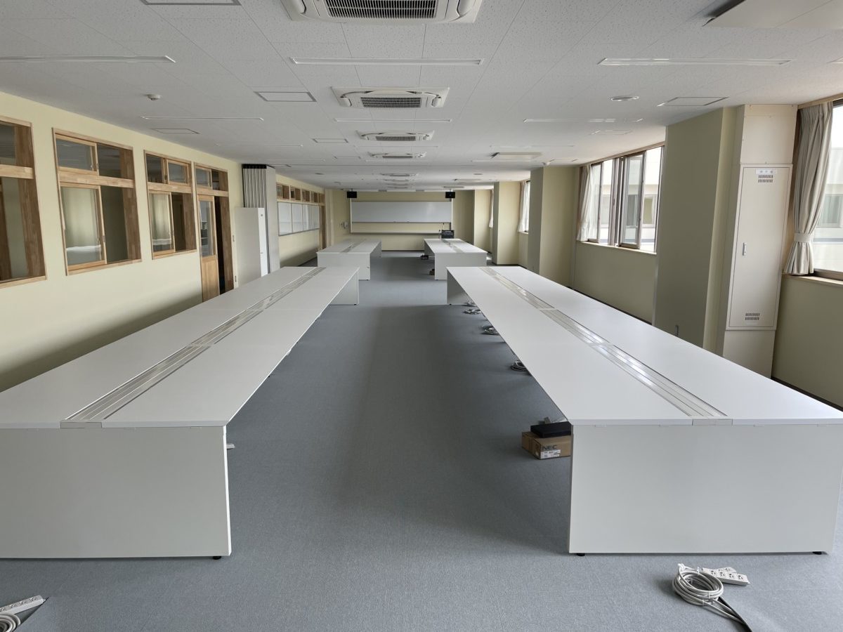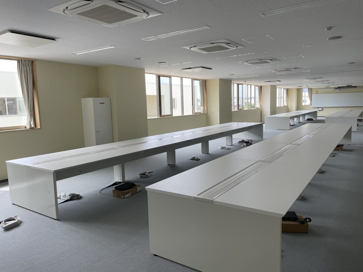 高等学校様の新校舎へ、実習室・コンピューター室にて使う両面デスクを納品させていただきました。
